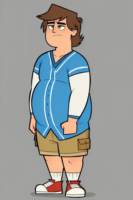 RipperTDI23, 1boy, messy brown hair, blue shirt with white long sleeves underneath, khaki shorts, red-accented white sneakers, dark green eyes, fat, chubby, ripper (tdi),