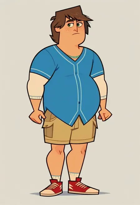 RipperTDI23, 1boy, messy brown hair, blue shirt with white long sleeves underneath, khaki shorts, red-accented white sneakers, dark green eyes, fat, chubby