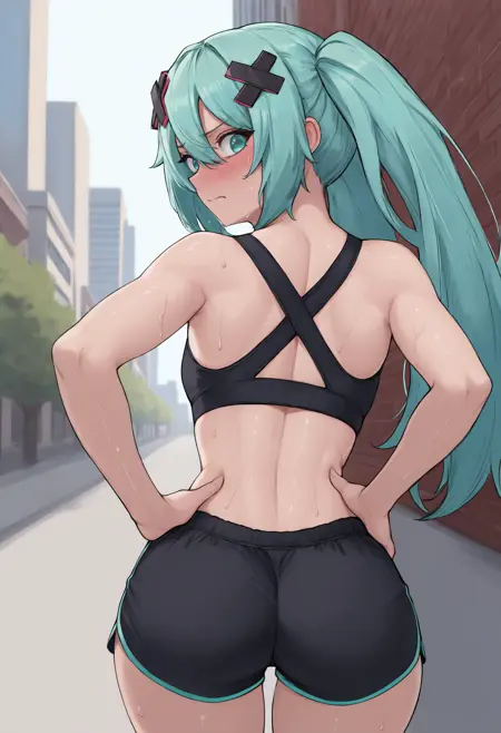 外观: aqua hair, hair between eyes, twintails, x hair ornament, aqua eyes