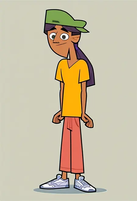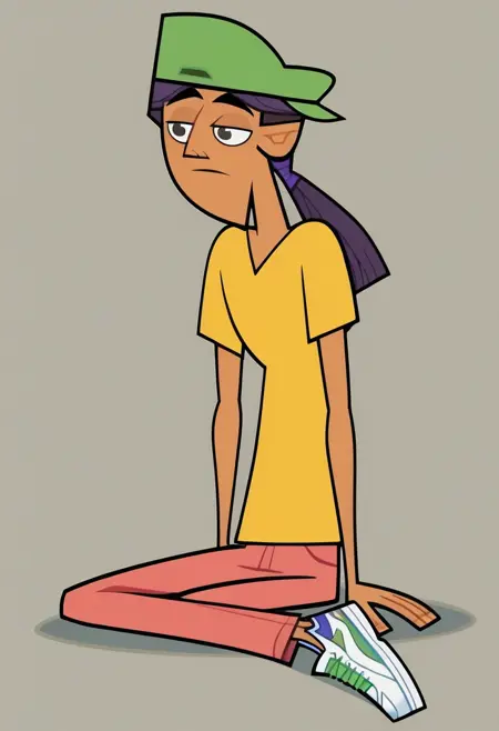 ZeeTDI23, 1boy, honey tan skin, mid back length raven-black straight hair, low ponytail, purple hair tie, apple green backwards cap, yellow T-shirt, salmon pink pants, white sneakers, dark brown-black eyes,