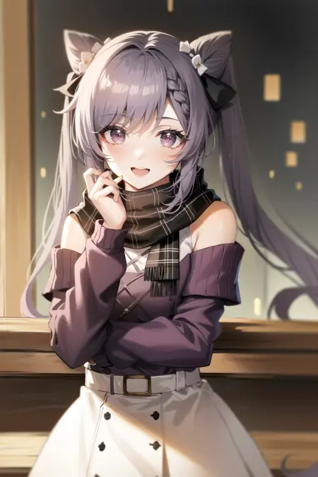 keqing (lantern rite) (genshin impact), keqing (genshin impact), 머리 묶음, 치마, 스카프, 보라색 스웨터, 하얀 치마, 보라색 머리, 스웨터, 투시앙, 보라색 눈, 다이아몬드 모양의 동공, 머리 장식, 어깨 노출, 웃는 얼굴, 가슴, 화살 머리 묶음, 긴 머리, 허리 벨트, 이중 머리 묶음, 긴 소매, 앞머리, 리본, 머리 꽃, 머리 리본, 리본, 머리 리본, 꼬임, 체크 무늬 스카프, 체크 패턴, 어깨 노출