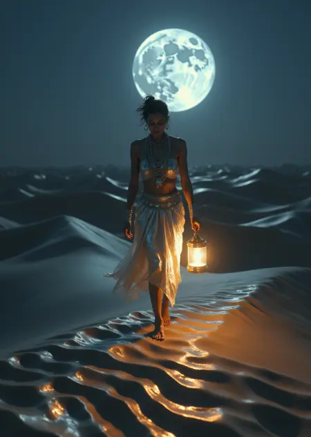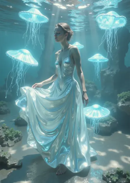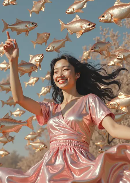 😉 使用示例: 此 LoRA 擅长创建超现实与幻想风格的图像,能将普通场景转化为魔法般的画面:例如月光下的沙漠中身着流动金属服饰的人物,或鱼群悬浮于空中的抽象构图,仿佛由液态物质构成。