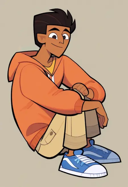 ChaseTDI23, 1boy, tan skin, orange hoodie, bottomless, yellow shirt, dark brown hair, dark brown-black eyes