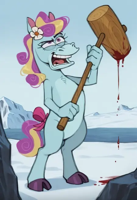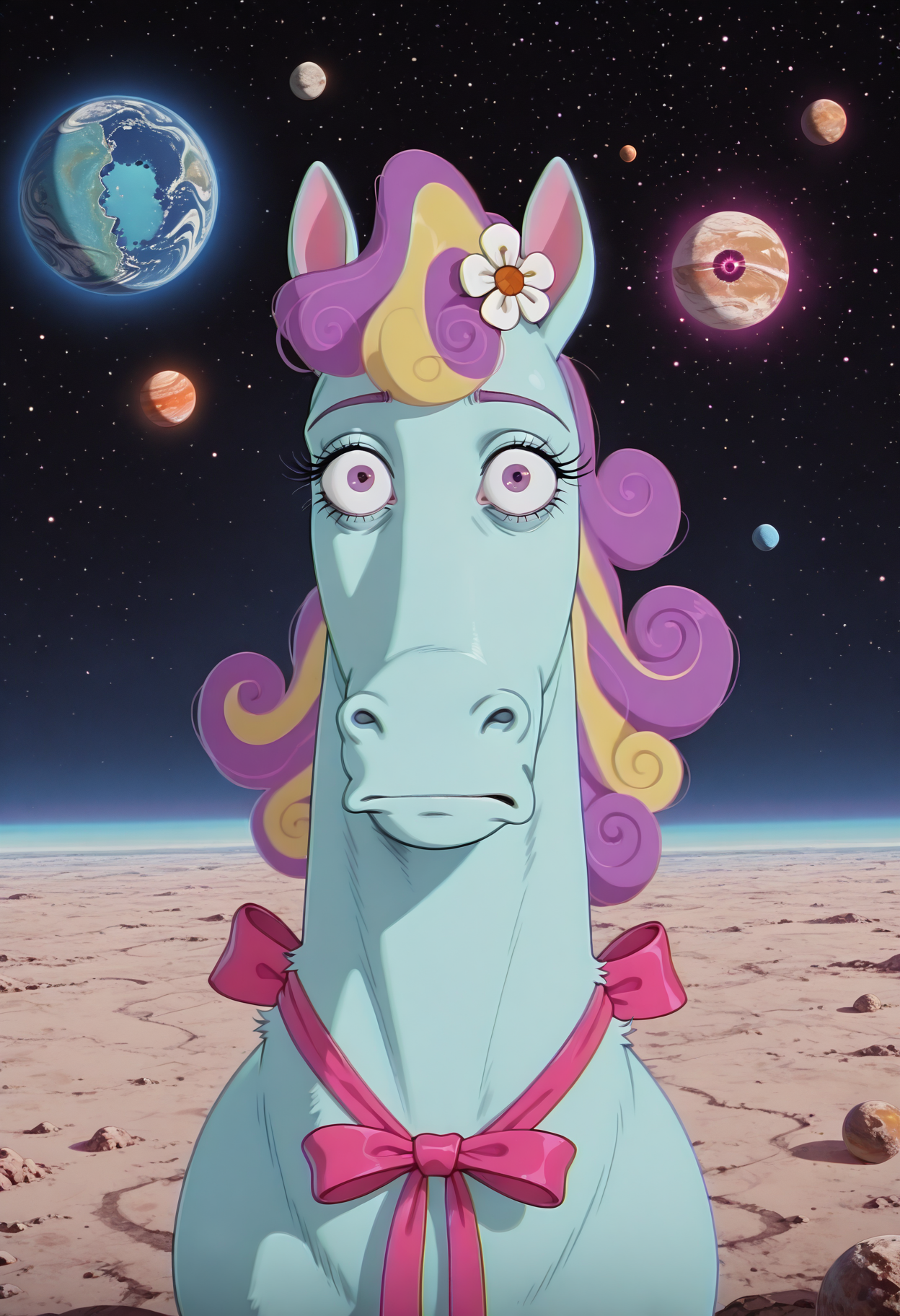 태그: 말, 연한 파란 털, 다채로운 머리카락, 속눈썹, 퐁퐁한 털갈이, 분홍 리본, 인물 없음, 머리카락 장미, 보라색 눈, 분홍 발굽, 동물 중심, 남성 중심, 안장(선택 사항), 반짝임(선택 사항), 야생, 머리카락 장미
