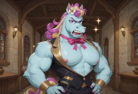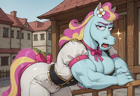 Tags: horse, light blue fur, multicolored hair, eyelashes, fluffy mane, pink ribbon, no humans, hair flower, purple eyes, pink hooves, animal focus, male focus, saddle (optional), sparkles (optional), feral, hair flower