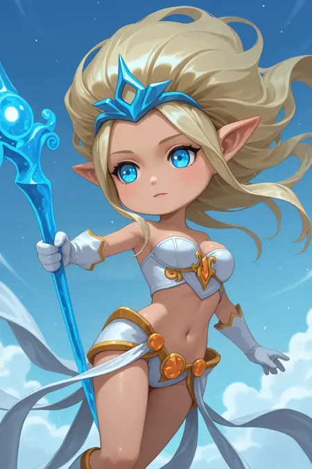 wind_goddess, 1girl, solo, pointy ears, blonde hair, breasts, long hair, gloves, blue eyes, navel, staff, cleavage,
