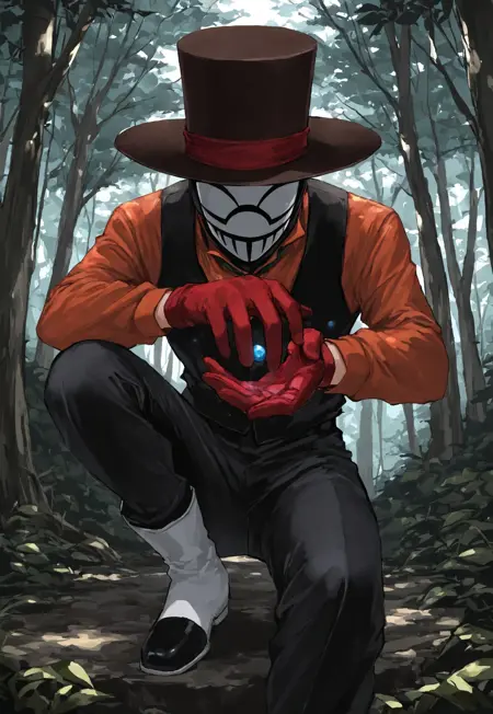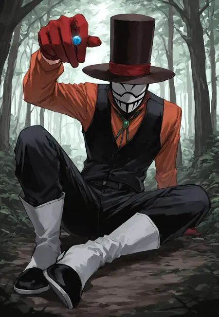 추천 캐릭터 태그(마스크 착용): 1boy, solo, top hat, mask, balaclava, shirt, vest, brooch, red gloves, pants, boots