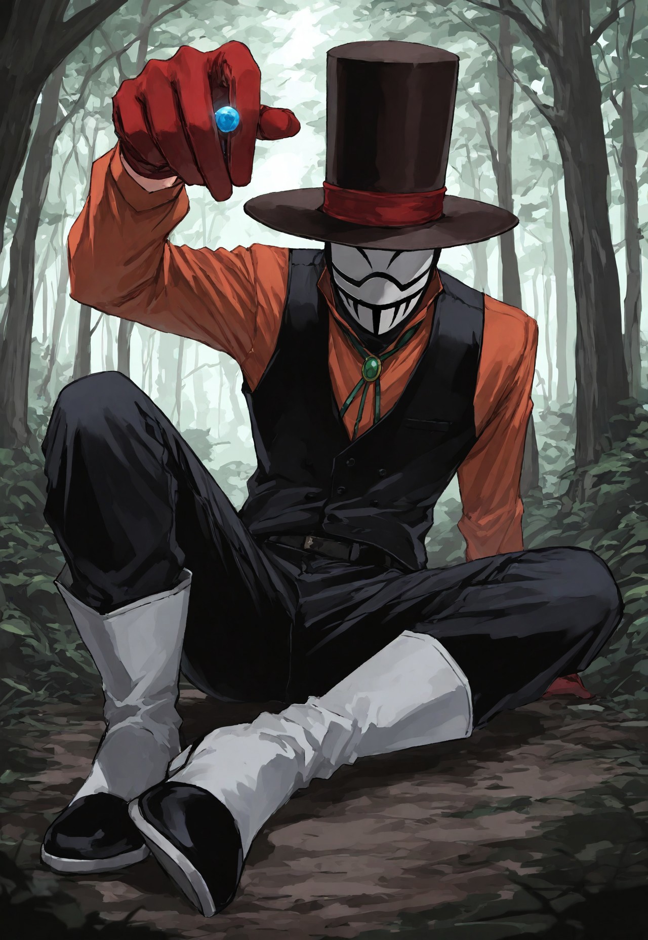 建议角色标签(戴面具): 1boy, solo, top hat, mask, balaclava, shirt, vest, brooch, red gloves, pants, boots