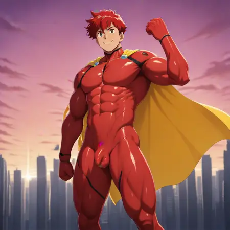 Roody, fully red bodysuit, red hair, pixie hair, abs , pixie hair, pixie cut, sky scrapers, red bodysuit, , small penis bulge, smile, fist in air, 1 boy, solo, yellow cape, short cape, city,