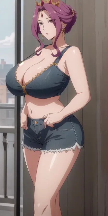 추가 액세서리들은 보석과 귀걸이(lora:Mirellia_Q_Melromarc:0.45, Mirellia_Q_Melromarc, big_breasts, purple_hair, purple_eyes, jewelry, earrings)의 뒤에 숨겨져 있는 듯하다.