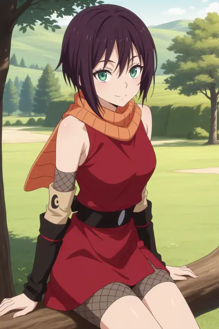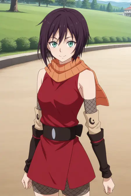 aasouka, 绿色眼睛, 棕色头发, 短发, soukadef, 橙色围巾, 红色连衣裙, 短款连衣裙, 无袖连衣裙, 黑色腰带, 连衣裙下穿短裤, 网状裤袜, 分离式袖子,