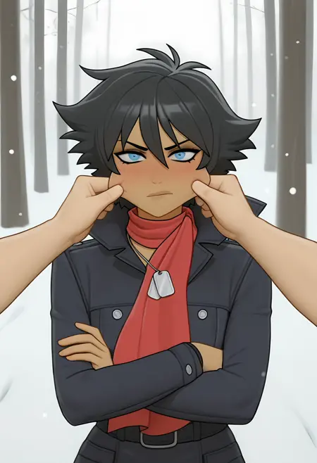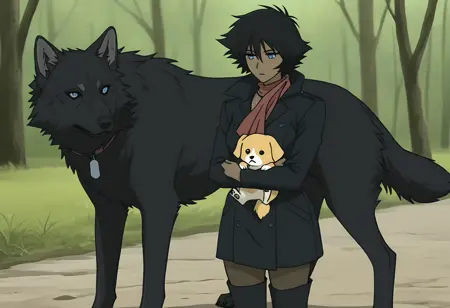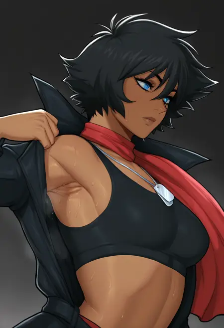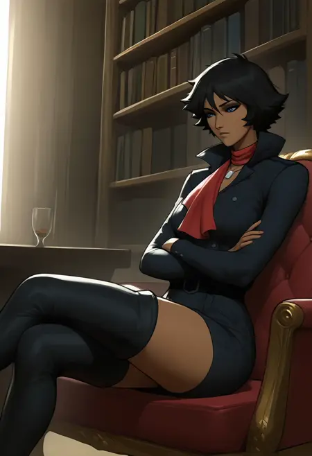 blu3_w0lf, black hair, messy hair, short hair, red scarf, blue eyes, dog tag, dark-skinned female, black coat, coat, black thigh boots, high-heeled thigh boots,