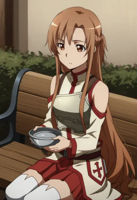 Trigger = zzasunayuukizz, Tags = 1girl, long hair, brown hair, brown eyes, solo, armor, breastplate, bare shoulders, detached sleeves, , thighhighs, red skirt, skirt, white thighhighs, very long hair, pleated skirt, holding, braid, bench
