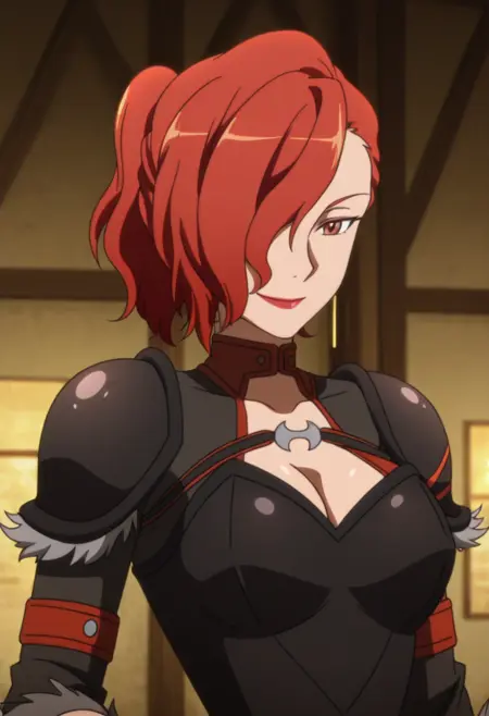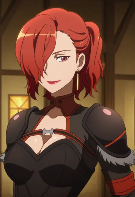 Trigger = zzrosaliazz, Tags = 1girl, red hair, hair over one eye, solo, cleavage, jewelry, earrings, breasts, armor, red eyes, lipstick, makeup, short hair, smile, gloves, anime coloring, ponytail, fingerless gloves, medium breastsm