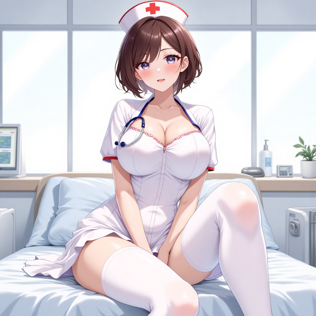 CTAI-애니메이션 소녀. 긴 물결 모양의 은색 머리카락, 파란 눈, 하얀 피부를 가진 젊은 여성을 디지털 애니메이션 스타일로 그린 그림. 그녀는 흰 티셔츠를 들어 올려 가슴을 드러내고 청바지 반바지를 입고 있다. 배경에는 침대, 램프, 창문이 있는 침실이 보인다.