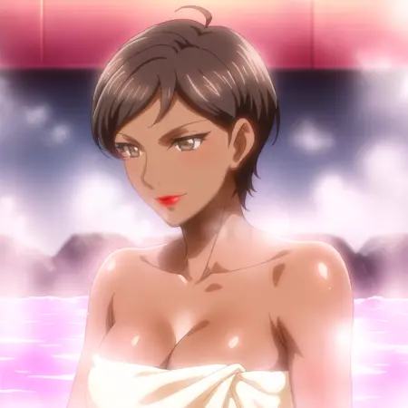 SelinaKyleHuntedTowel, 1girl, short hair, naked towel, dark skin, dark-skinned female, medium breasts, brown hair, lipstick, cleavage, steam, brown eyes, onsen, makeup, bare shoulders