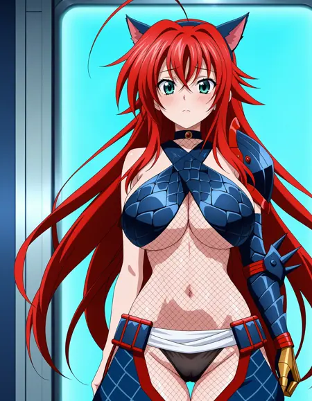 rias gremory, 巨大呆毛, 长发, 发丝遮眼, 绿眼, 侧发, 红发, (巨乳:1.2 曲线臀部), 闪亮肌肤, 闪亮身材, 动画截图, 动画上色,