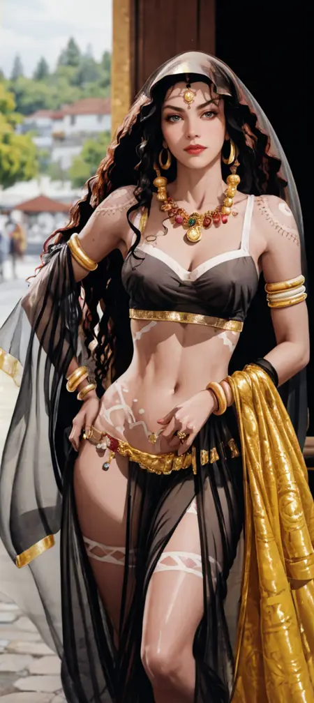 阿拉伯服饰,部落风,珠宝,手镯,耳环,长裙,臂环,身体彩绘,肚脐,透视,面纱,纱丽,金色,链条,腰链,刺绣,