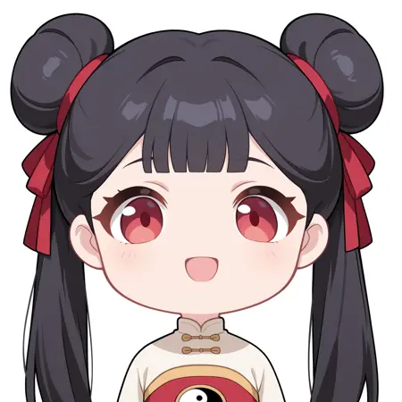 limeiling_CCS98, 검은 머리, 긴 머리, 트윈테일, 더블 버, 머리 리본, 빨간 리본, 곧은 앞머리, 붉은 눈, 중국식 복장, 금장식, 음양 문양 복장, 긴 소매, 넓은 소매, 계단식 소매, 종, 흰색 자전거 반바지, 빨간 구두,