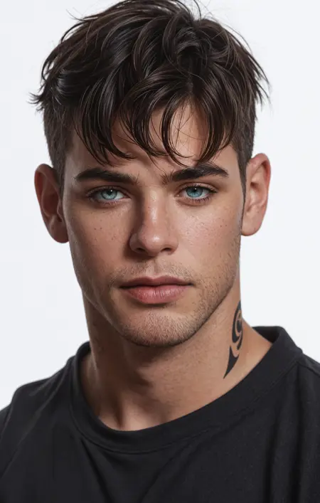 깨끗한 헤어컷(페이드), 모델 같은 얼굴, 볼륨 있는 입술, 세밀한 눈썹, 뚜렷한 턱선, 드레드록 등.