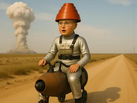 この Booji Boy は、General Boy のサルの息子であり、恐ろしい Turkey Monkey の標的です。Booji Boy は選択や対立、自律性から解放された存在です。土曜日の朝のアニメのように幸せで、周囲の恐ろしさには無頓着。痛みに気づかず、ただ笑い続けます。彼こそが DEVO です。