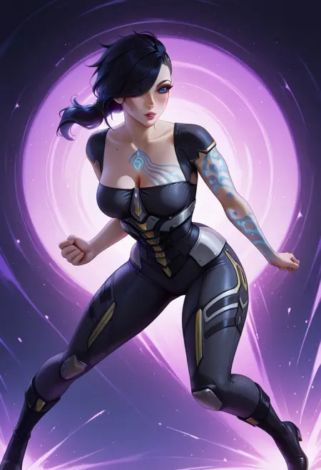 black hair, asymmetrical hair, blue eyes, freckles, blue tattoos, hair over one eye, makeup,