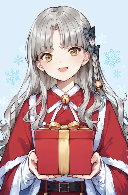 nagaminekaede, long hair, wavy hair, grey hair, blunt bangs, parted bangs, single braid, hair bow, yellow eyes