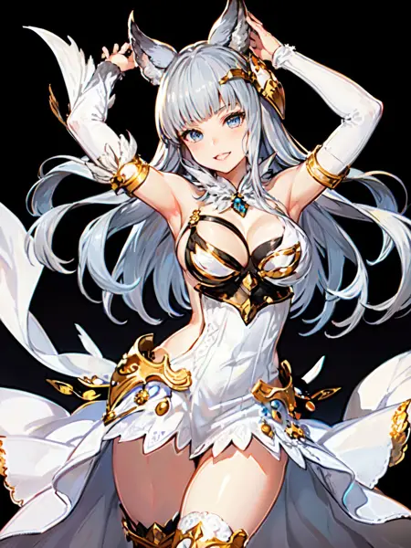 プロンプト:1girl, 青い目, 白髪, 動物の耳, 髪飾り, ["あなたの衣装"]