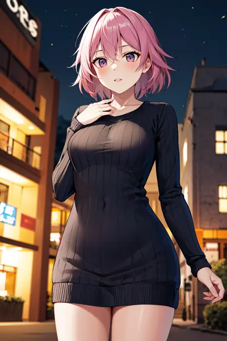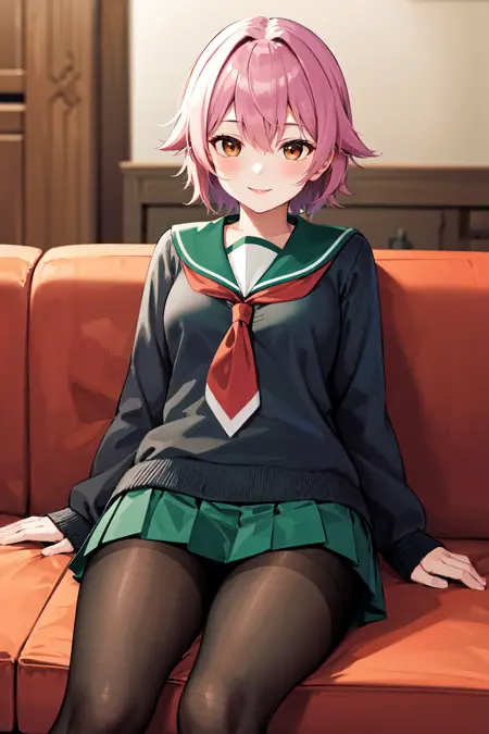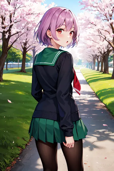 outfit3aatama, short hair, green sailor collar, red neckerchief, black sweater, long sleeves, green skirt, black pantyhose