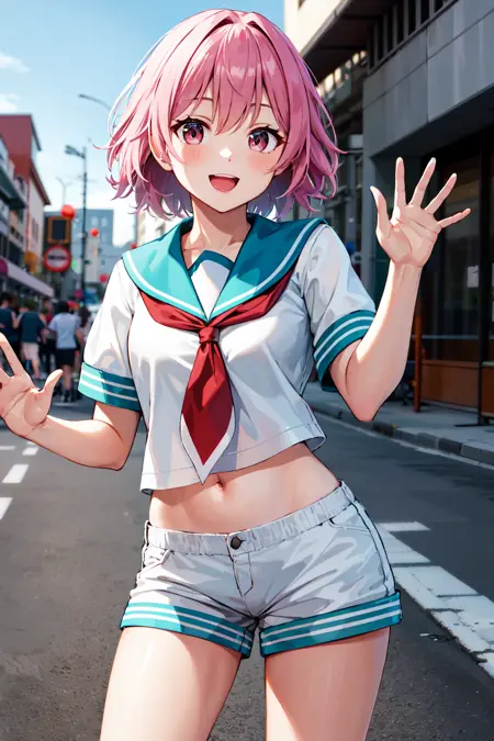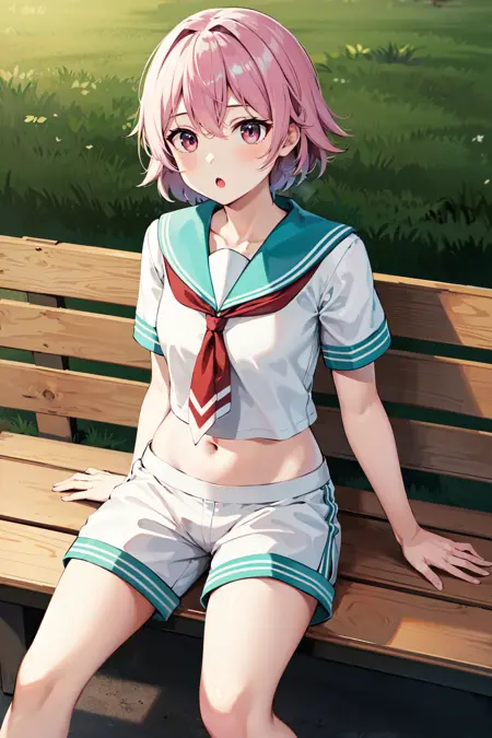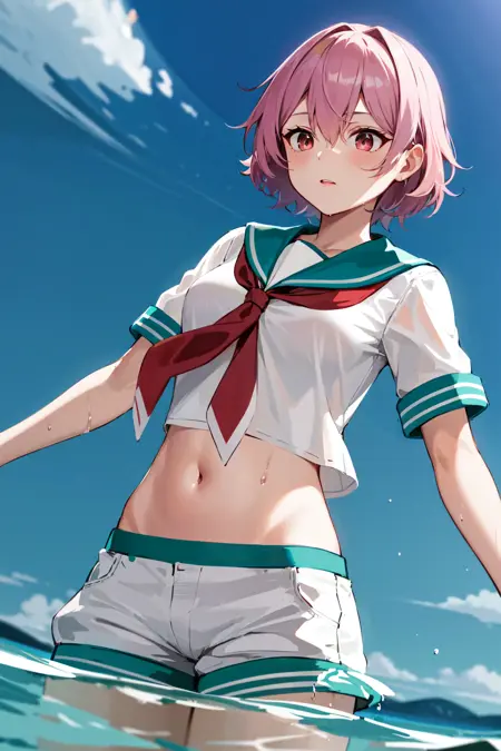 아우트핏1aatama, 단발 머리, 파란색 선원 칼라, 빨간색 넥커치프, 흰색 셔츠, 짧은 소매, 배꼽, 흰색 반바지