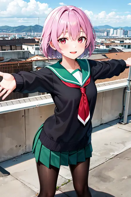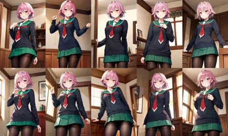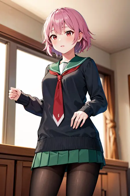 아우트핏3aatama, 단발 머리, 녹색 선원 칼라, 빨간색 넥커치프, 검은 스웨터, 긴 소매, 녹색 치마, 검은 팬티스타킹