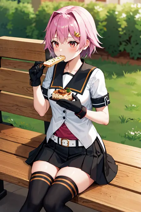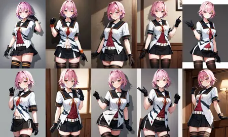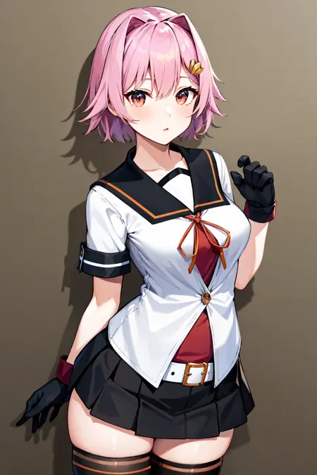아우트핏2aatama, 단발 머리, 머리 장식, 검은색 선원 칼라, 선원 셔츠, 애니멀 프린트, 짧은 소매, 검은 장갑, 벨트, 검은 치마, 검은 허벅지 양말