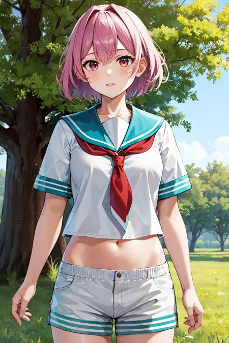 outfit1aatama, short hair, blue sailor collar, red neckerchief, white shirt, short sleeves, navel, white shorts