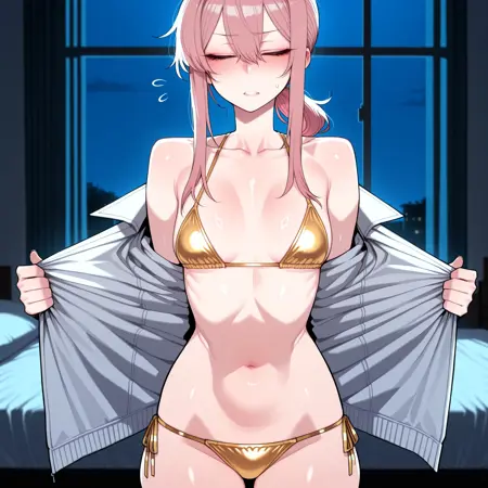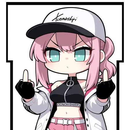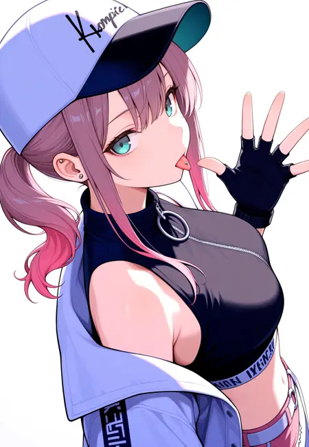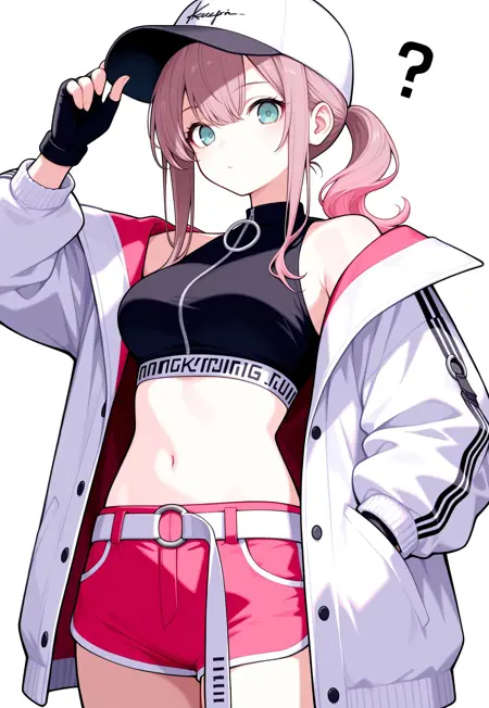 white baseball cap, white jacket, open clothes, short shorts, pink shorts, belt, fingerless gloves, crop top, navel