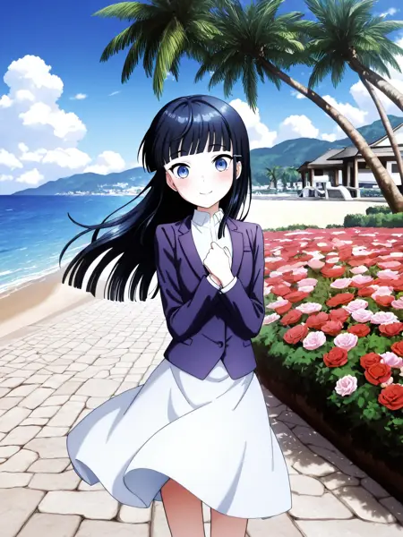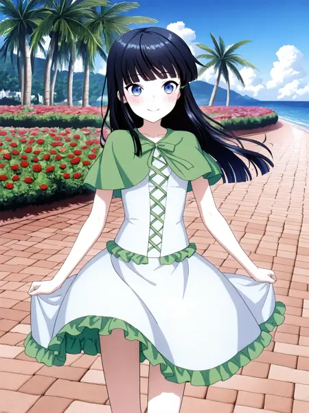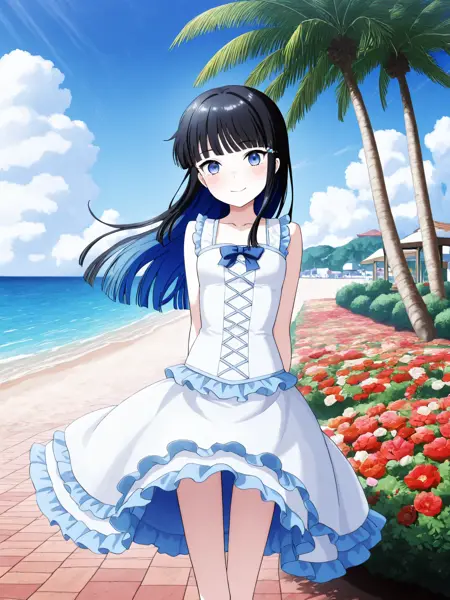 miyuki_jc, miyuki_jcdress, 蓝色眼睛, 黑色头发, 蓝色头发, 短发配长发束, 短马尾, 发带, 齐刘海, 侧发, 头饰, 发夹, 白皙皮肤