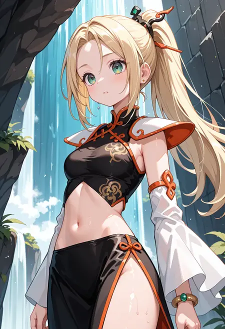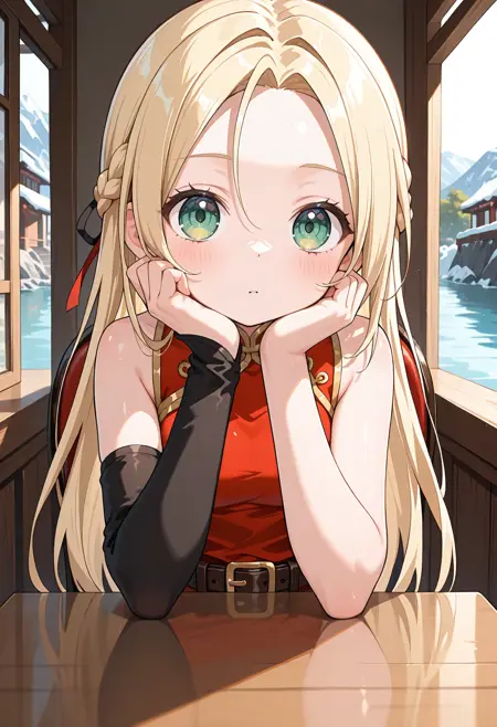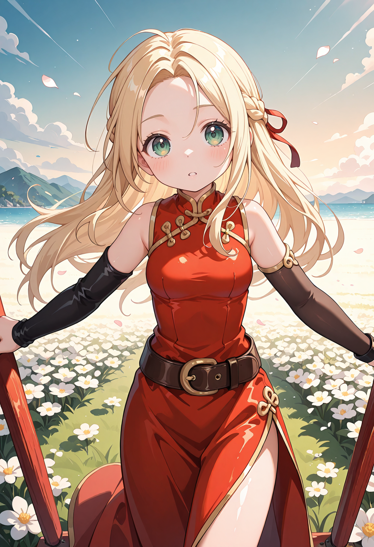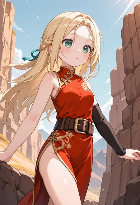 기본 복장: minaoutfit1, 빨간 중국복, 땋은 머리, 검은 단일 분리형 소매, 벨트