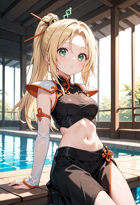 신령 복장: minaoutfit2, 어깨 패드, 폰테일, 분리형 소매, 검은 상의, 흑백 중국복, 허리 부분, 보석, 머리 장신구
