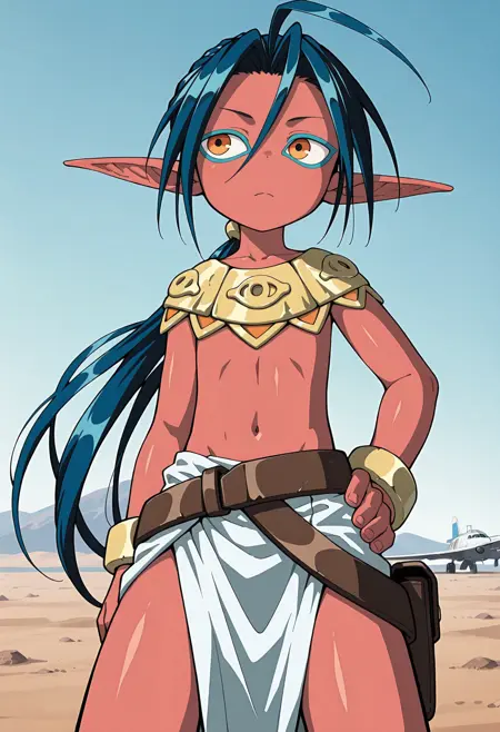 法老服装:ramuoutfit2,长而尖的耳朵,水蓝色眼线,红色皮肤,多条辫子,头饰,耳环,珠宝,上身裸露,{头带|蛇冠},无指手套,红色腰带,白色斗篷,骨盆帘