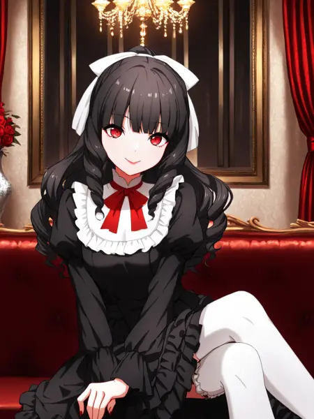 夜大小姐,红眼睛,黑发,长发,钻头发,发带,红色发带,发饰,发花,妆容