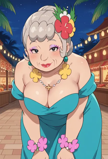single hair bun, lipstick, eyeshadow, flower hair ornament, flower necklace, flower bracelets, earrings, teal dress