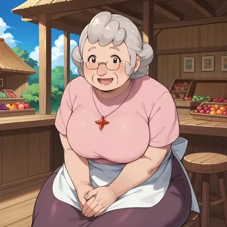glasses, red necklace, pink shirt, purple skirt, white apron