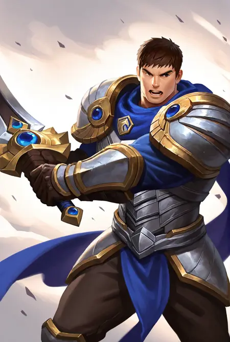 garen lol, armor, brown hair, shoulder armor, pauldrons, gloves, short hair, pants, cape, sword, holding weapon
