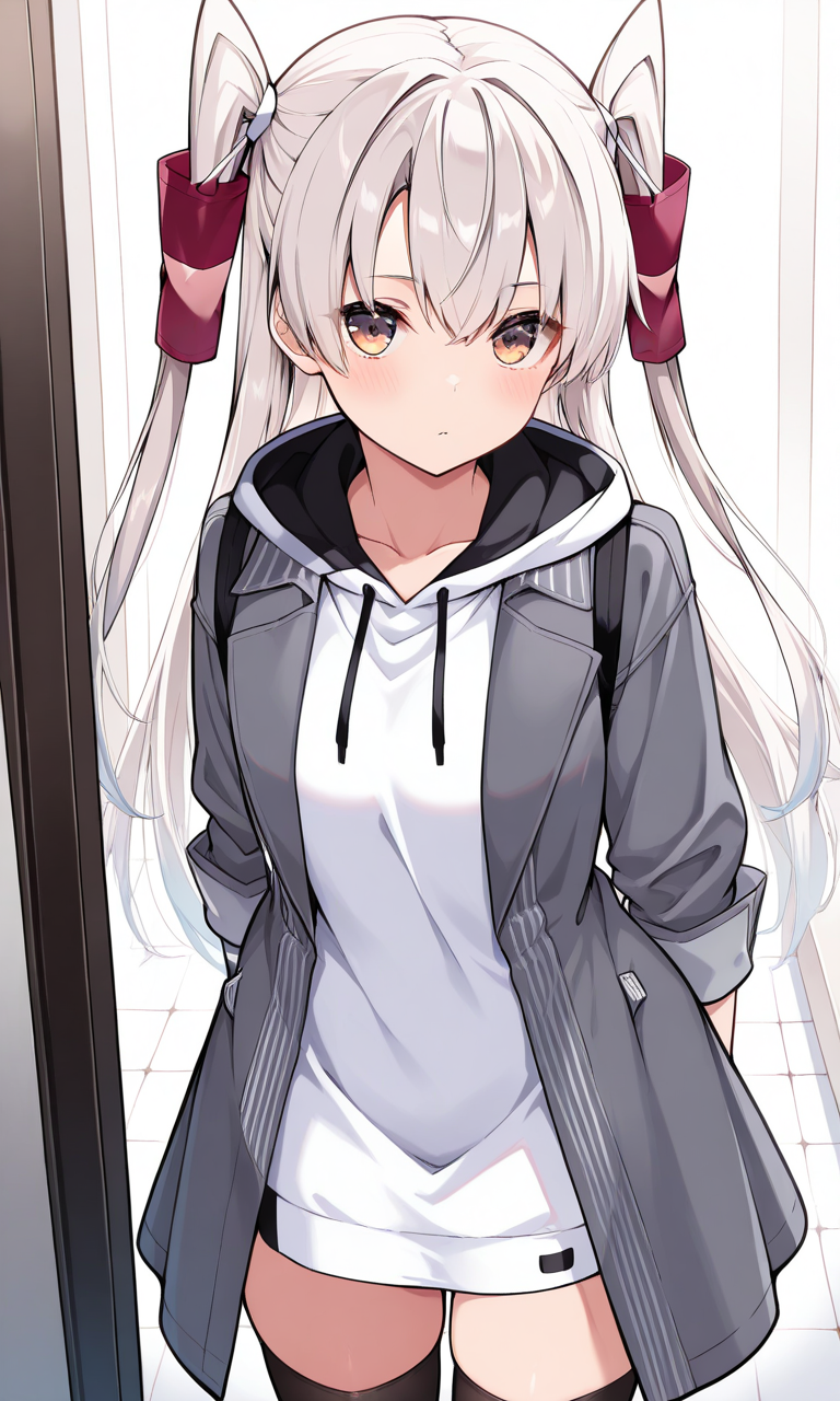데이트 복장: amatsukazedateKC, 긴 머리, 허벅지 양말, 긴 소매, 흰 드레스, 줄무늬, 검은 허벅지 양말, 후드, 양쪽 올려진 머리, 코트, 머리 튜브, 회색 코트