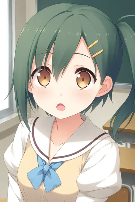 enomoto kaho,yellow eyes,brown eyes,green hair,short hair,hairclip,hair between eyes,side ponytail,