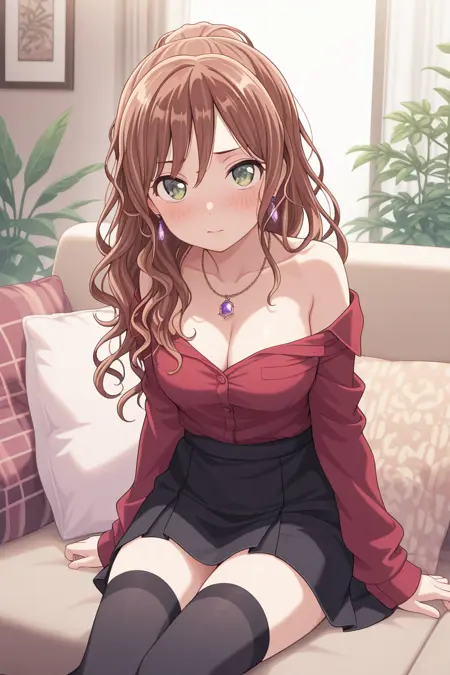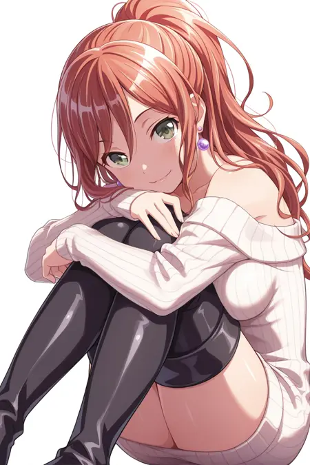 lisa_imai, 1girl, solo, jewelry, long hair, earrings, smile, sweater dress, sweater, looking at viewer, belt, brown hair, off-shoulder sweater, necklace, off shoulder, dress, ribbed sweater, collarbone, green eyes, bangs, black belt, long sleeves, bare shoulders, sweatersk