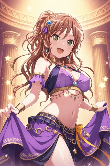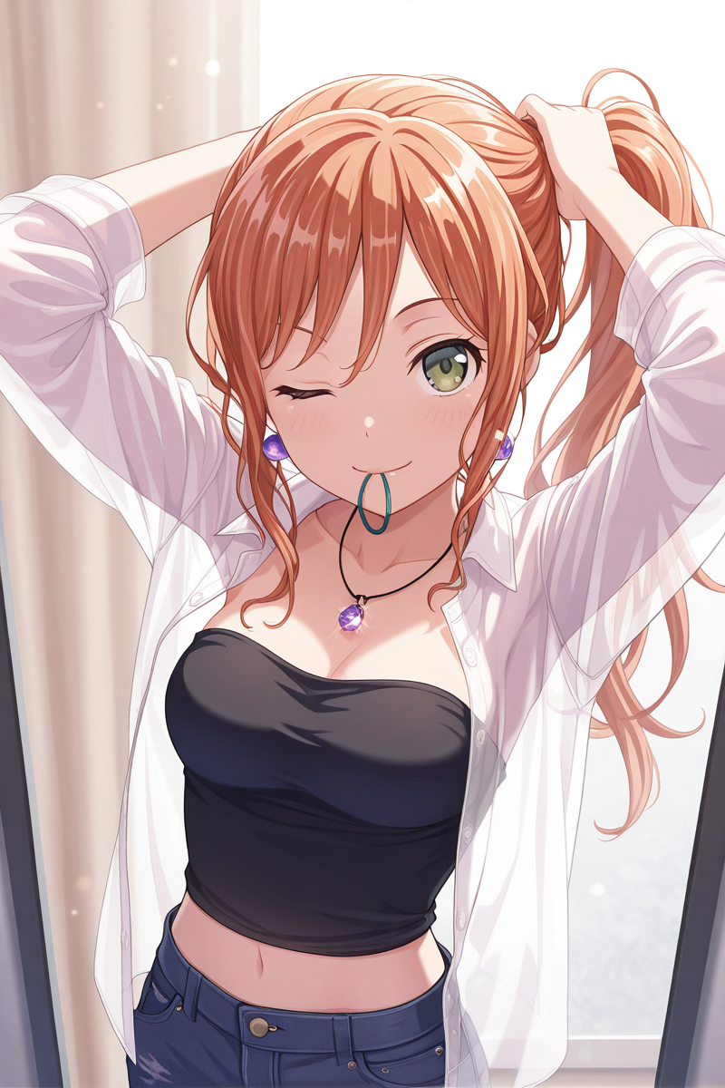 lisa_imai, 1girl, solo, necktie, skirt, school uniform, earrings, long hair, jewelry, striped necktie, jacket, brown hair, smile, hand on hip, looking at viewer, green eyes, pleated skirt, grey jacket, long sleeves, bangs, striped, plaid skirt, plaid, collared shirt, shirt, yotsuba school uniform