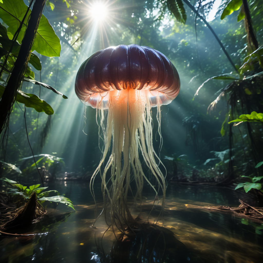 blurry, bulbous, dappled sunlight, depth of field, floating, light rays, muagh, reflection, sunbeam, tentacles,