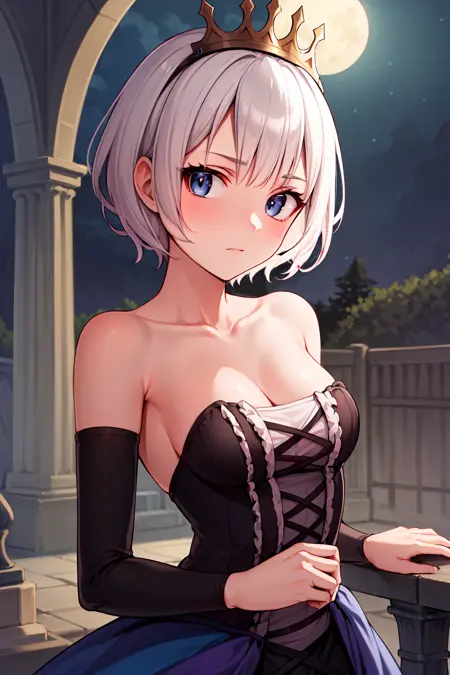 To prompt Gwendolyn in her combat outfit, enter "lora:Gwenv2:strengthGwenos, short hair, low feathers, white strapless dress, tiara, detached gauntlets, gold collar, armored thigh boots, hair buns"