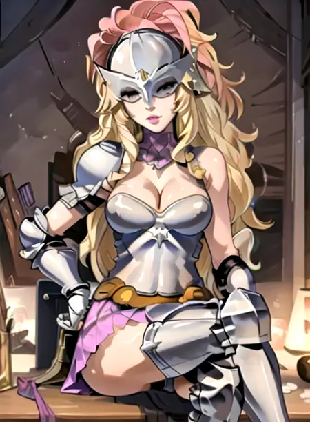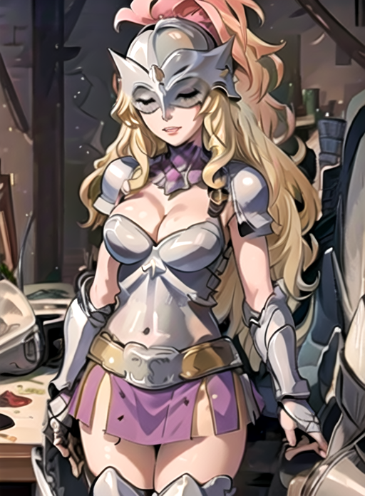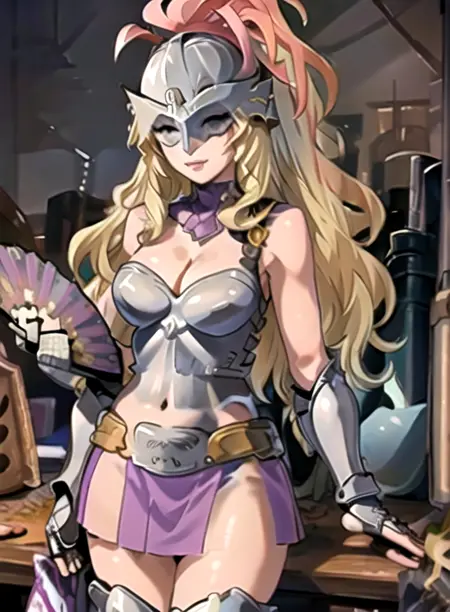 已测试于 0.7-1触发词foxy, long hair, cleavage, armor, blonde hair, mask, helmet, shoulder armor, standing, lipstick,
