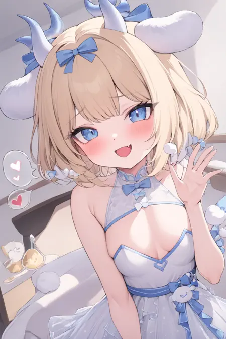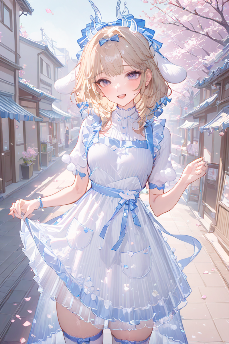 , horns, blue eyes, blonde hair, dress, bow, short hair, white dress, thighhighs, <lora:Yao_Cinnamoroll:1>